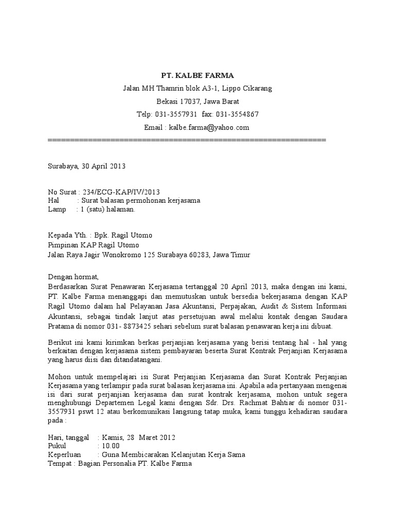 Contoh Surat Balasan Permohonan Kerjasama from image.slidesharecdn.com Surat penawaran merupakan suatu surat yang ditujukan kepada suatu instansi yang bertujuan untuk menawarkan sesuatu. Tak memandang usia, banyak dari mereka yang masih berusia remaja bahkan yang sudah tua juga menggeluti profesi. Ketika menjelaskan produk haruslah jelas deskripsi barang yang ditawarkan, disertai manfaat dan harga produk tersebut. 17th desember 2020 5 min read. Surat diatas merupakan contoh surat penawaran jasa yang dikirimkan oleh pt. Sebuah surat penawaran barang dibuat dalam bentuk surat formal yang di dalamnya tertera dengan jelas penjelasan mengenai barang atau jasa yang sedang ditawarkan beserta rincian harganya. Jika iya, sekarang anda membaca artikel yang tepat. Biasanya surat penawaran ini dibuat oleh para pengusaha atau pebisnis dalam segi ekonomi berupa negosiasi.