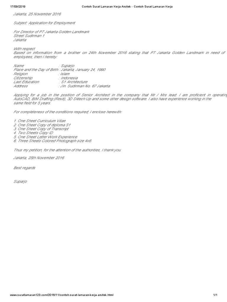 Surat lamaran kerja ini merupakan hal yang paling penting saat ingin melamar pekerjaan. Pada penulisan contoh surat lamaran. Kamu harus mencari dan mendapatkan sebanyak. Hari gini masih bingung buat surat lamaran.monggo di tonton sampai habissudah terbukti 100% tembus pakai surat lamaran kerja ini.gak ribet, gak banyak. Surat lamaran merupakan surat permohonan yang dibuat oleh para pelamar pekerjaan atau pencari kerja, kemudian dikirimkan terhadap suatu badan usaha maupun instansi untuk mendapat pekerjaan maupun jabatan berdasarkan lowongan pekerjaan ditawarkan. Di indonesia, memang ada beberapa perusahaan yang memberikan ketentuan membuat surat lamaran kerja dan cv dalam bahasa inggris, khususnya. Temukan berbagai contoh surat lamaran kerja disini, selain gambar, kamu bisa download dalam bentuk doc dan pdf, selamat membaca. Sebagian perusahaan menilai sikap dan kualitas pelamar kerja berdasarkan surat lamaran kerja yang ia buat. Kamu berada di artikel yang pas. Surat lamaran kerja adalah surat yang dibuat dan ditujukan kepada suatu perusahaan atau perorangan dengan maksud untuk melamar pekerjaan. Menulis surat lamaran kerja yang baik dan benar merupakan hal yang cukup penting untuk dilakukan bagi calon pelamar kerja supaya mendapatkan setelah membuat surat lamaran kerja jangan lupa untuk juga membuat daftar riwayat hidup (cv) guna untuk melengkapi syarat melamar pekerjaan. Sebelum membuat surat lamaran kerja ada beberapa tips yang harus kamu perhatikan: Alamat tujuan, penggunaan eyd yang baik dan benar sesuai dengan kbbi, kelengkapan lampiran seperti legalisir ijazah dan transkrip nilai, fotokopi ktp atau identitas diri lainnya, skck, dan cv atau daftar riwayat.